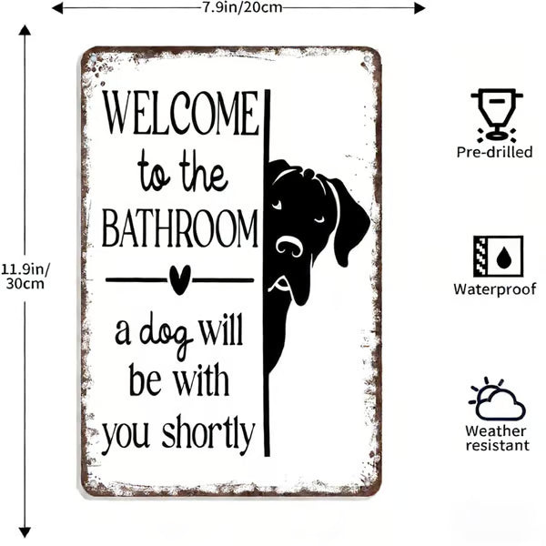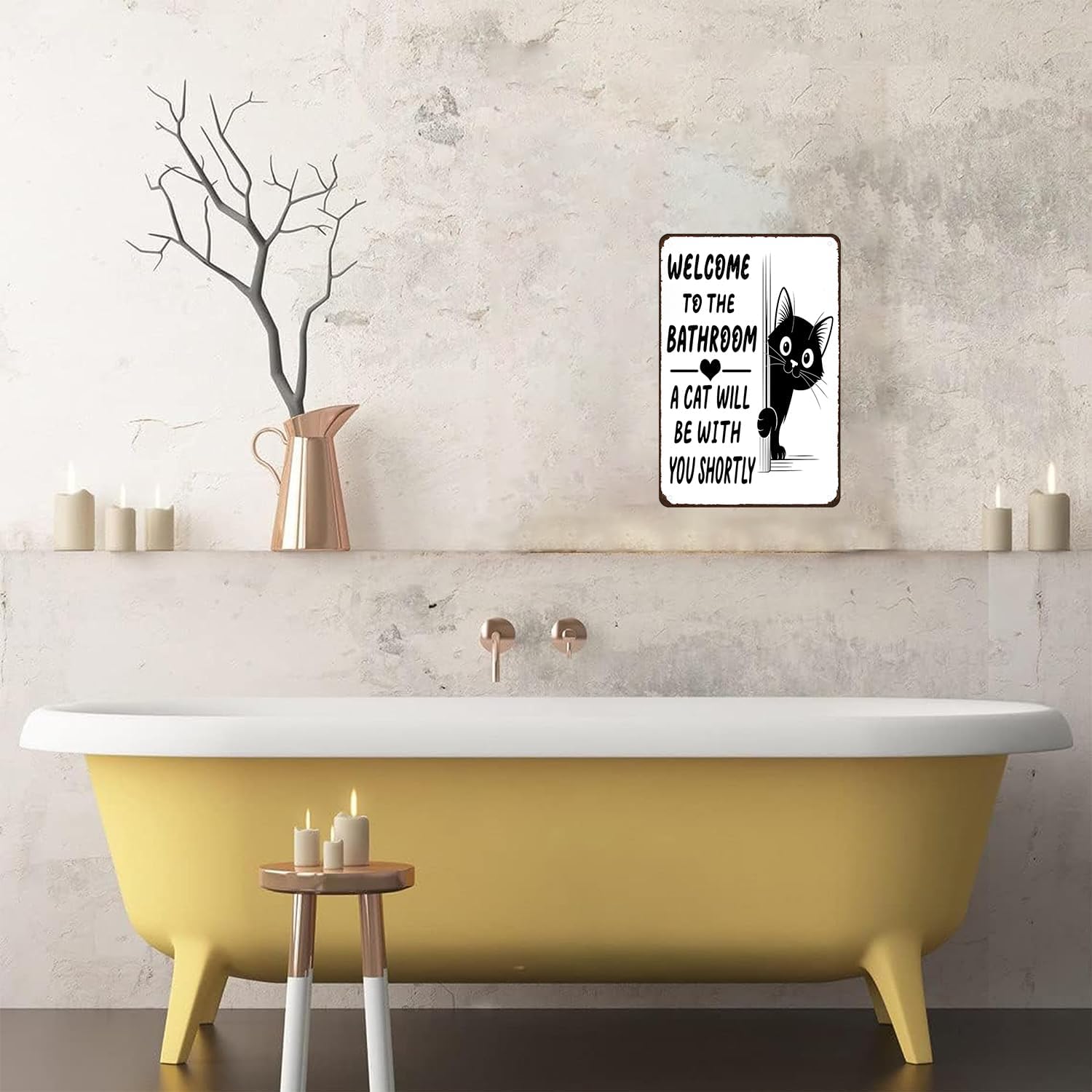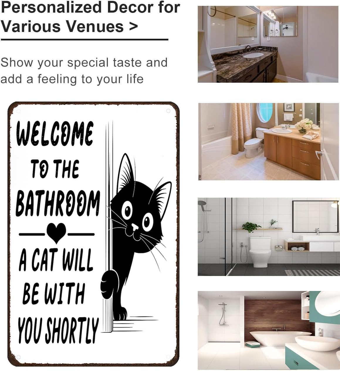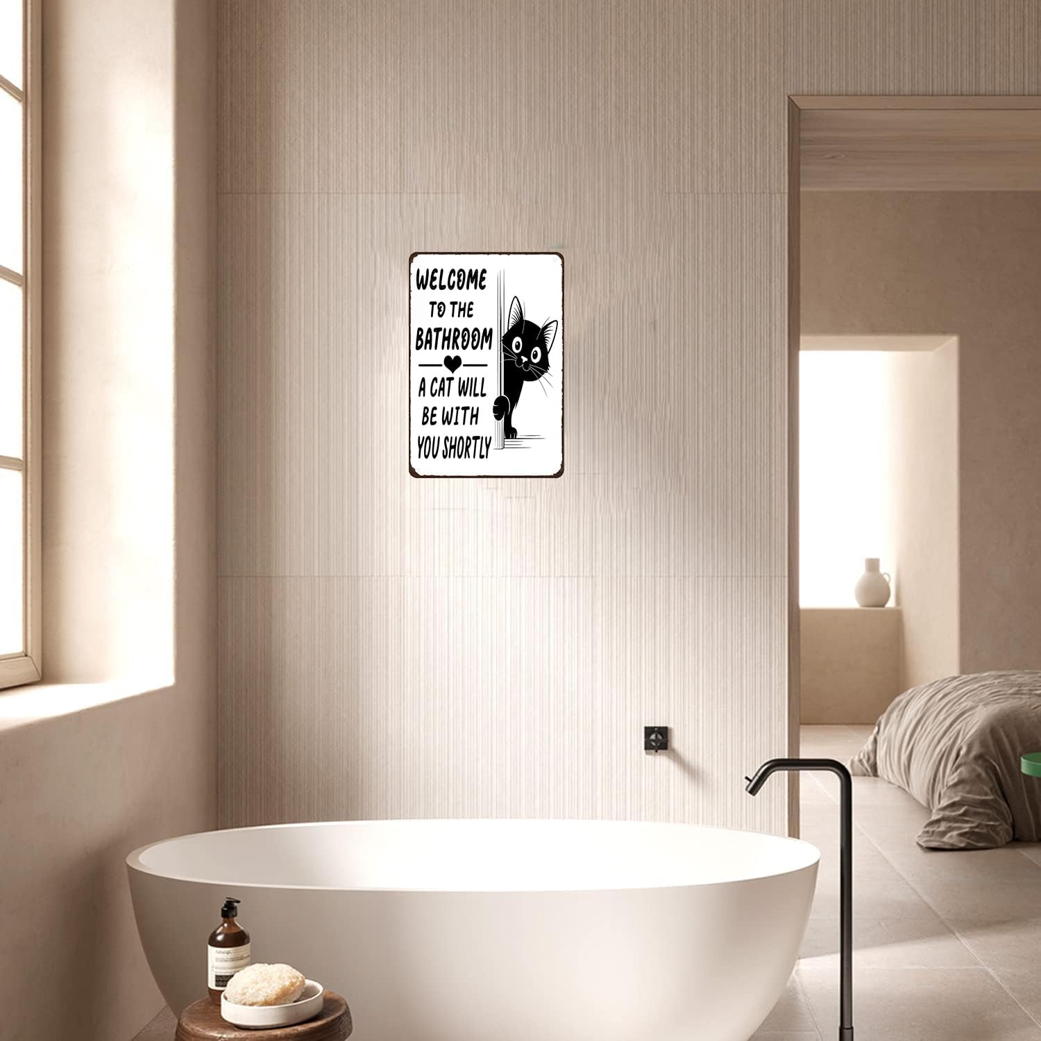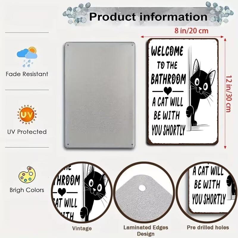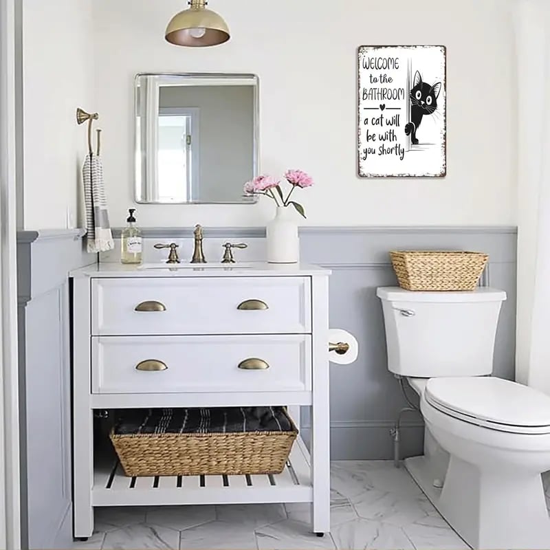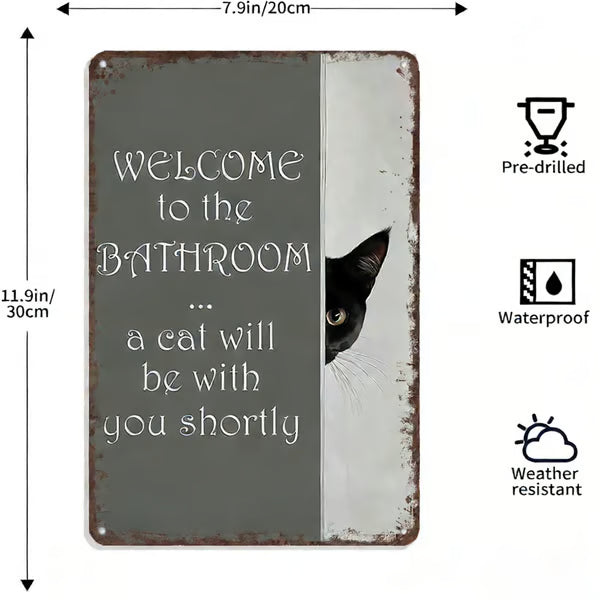 Det lekfulla budskapet ”Välkommen till badrummet – en katt kommer strax” i kombination med en bedårande katt som kikar fram bakom hörnet ger omedelbar charm och humor. Det är en vänlig påminnelse om att när man har en katt är man aldrig riktigt ensam – inte ens på badrummet.