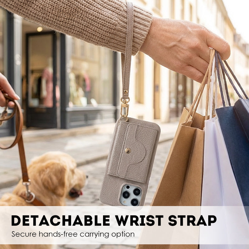 AVTAGBAR HANDLEDSREM â Med en matchande handledsrem i PU-lĂ€der för sĂ€ker bĂ€rning utan hĂ€nder. Den ger extra skydd mot fall och gör det lĂ€ttare att bĂ€ra din telefon nĂ€r du inte har en hand ledig.