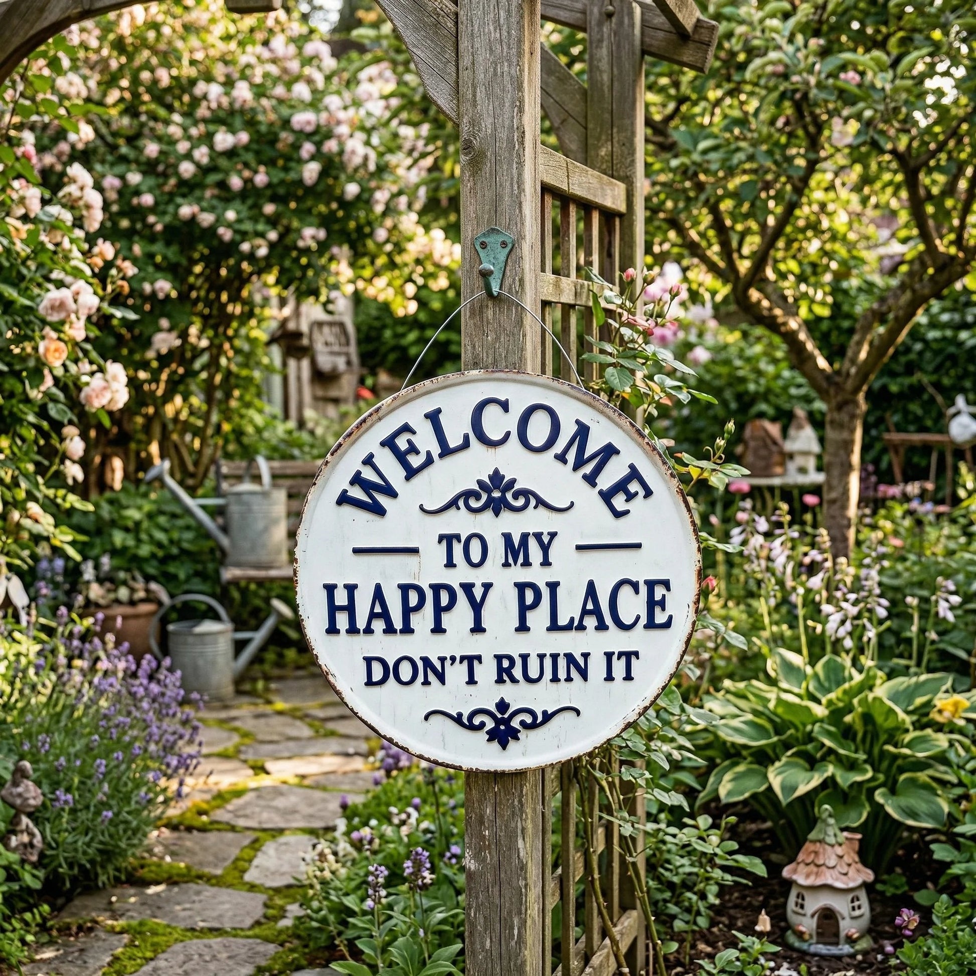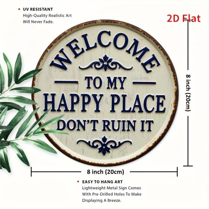 Vintage rund metallskylt – ”Välkommen till min lyckliga plats, förstör den inte” – väggdekoration för trädgården